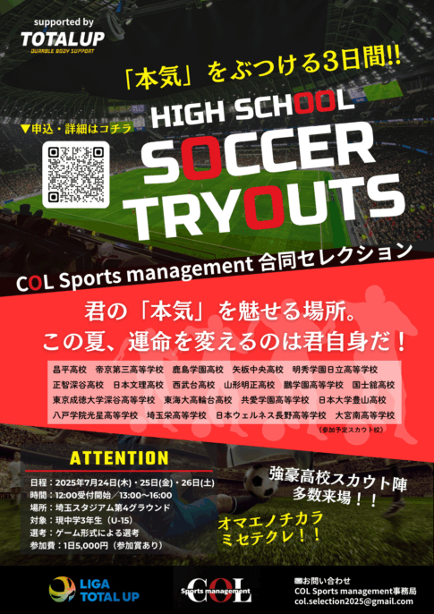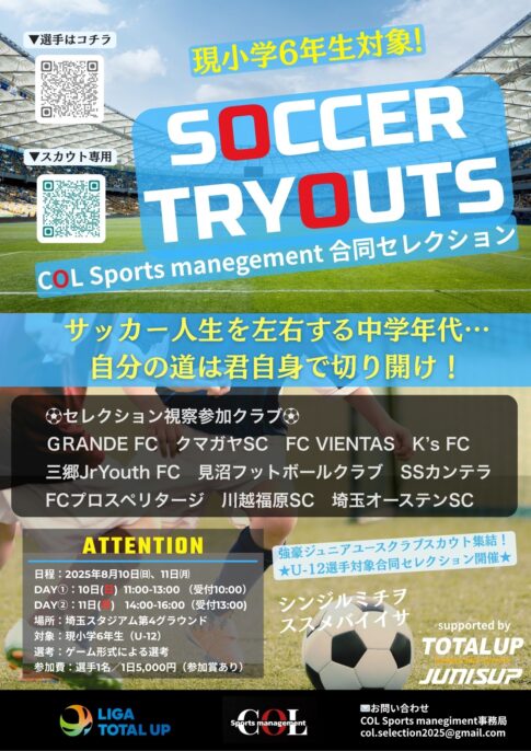 LIGA TOTAL UPについて 本リーグは埼玉県ジュニアユースサッカーで育った選手が世界に誇れるサッカー選手、社会で活躍する大人へ成長するための育成を目的とした私設リーグです。 大会概要 新着記事 2026シーズン、新たに「LIGA TOTALUP FUJI」「LIGA TOTALUP KEIHIN」が始動!2026.03.18オリジナルTシャツ販売START2026.03.18LIGA TOTALUP SAITAMA &IBARAKI 4月開幕2026.03.042026 LIGA TOTALUP IBARAKI新設のお知らせ2026.03.01高校サッカードットコム、YAHOO!ニュースに掲載されました!2026.02.182026シーズン『新規加盟クラブ募集スタート』2026.01.21サッカーブランドTRES(トレス)とお得な情報のご案内2025.08.22COL Sports management 合同セレクション開催のお知らせ2025.08.04 最新の試合結果 準備中 まだ表示できる投稿がありません。 試合結果一覧 準備中 参加カテゴリ 埼玉SAITAMA 1部 2部 3部 1部 2部 3部 北部 南部 茨城IBARAKI Liga Sponsor リーグ運営/事務局