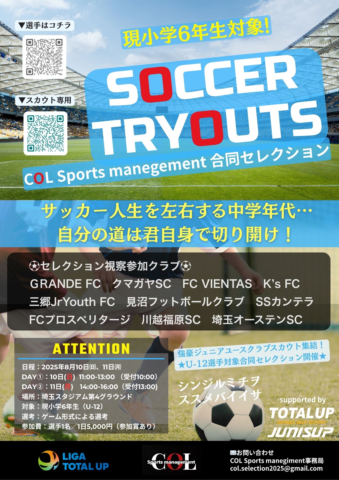 LIGA TOTALUP加盟クラブの皆様には、選手発掘・リクルートの機会として、本セレクションをご活用いただければと思います。
