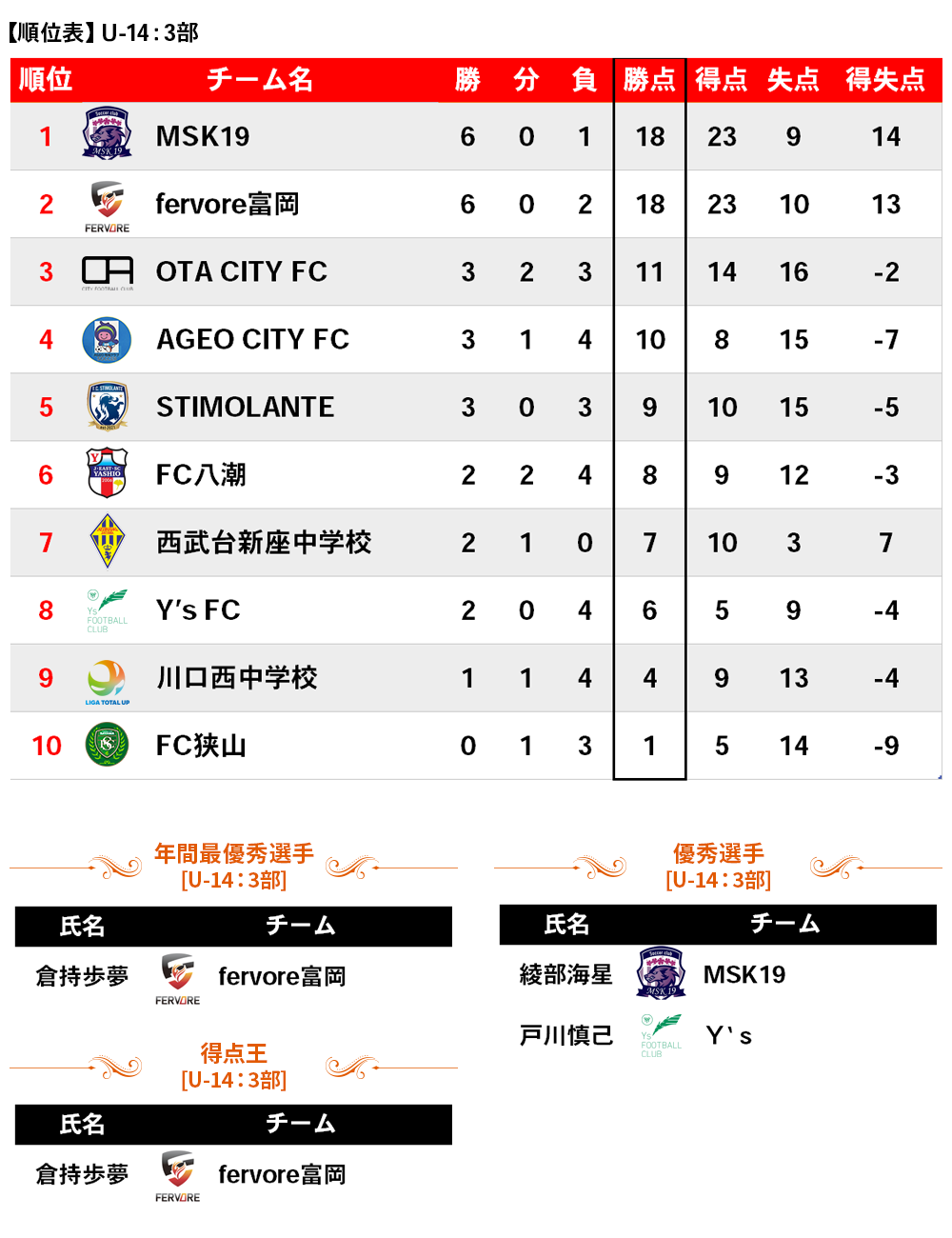 | 上尾SC | 3 | 1 | 5 | 10 | 12 | 24 | -12 | |