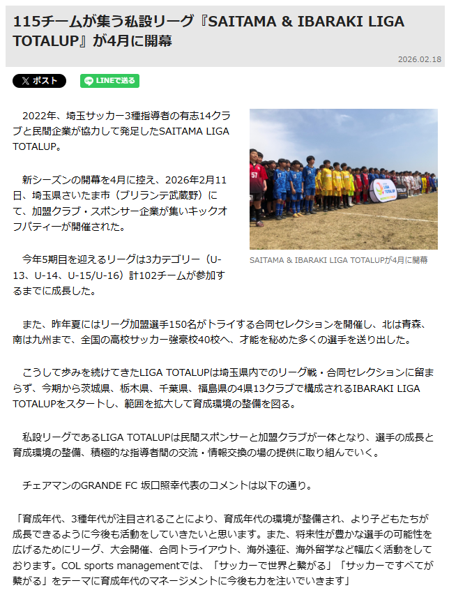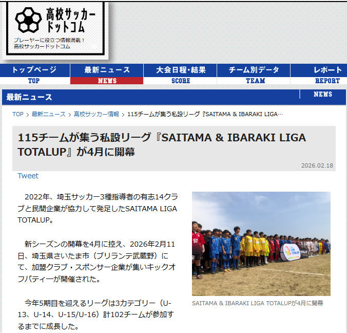 115チームが集う私設リーグ『SAITAMA & IBARAKI LIGA TOTALUP』が4月に開幕