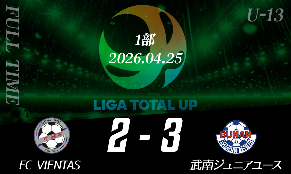 FC VIENTAS vs 武南ジュニアユース 18 田中雄貴10 野島波留得点者19 長谷川裕汰14 村上一季29 小熊隼叶18 田中雄貴MOM19 長谷川裕汰 その他試合結果 FC VIENTAS vs 武南ジュニアユースGRANDE FC vs アルティスタ浅間GRANDE FC vs プレジールSCクマガヤSC vs プレジールSCアルティスタ浅間 vs クマガヤSCアルティスタ浅間 vs GRAMADO FCクマガヤSC vs GRAMADO FC FCプロスペリダージ vs 大宮西カリオカFC境トリニタス vs LEARNERS