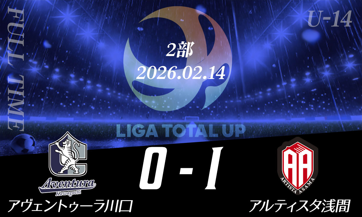 アヴェントゥーラ川口 vs アルティスタ浅間 ー得点者77 大塚樹3 杉浦颯汰MOM56 金澤幸輝 その他試合結果 越谷FC vs 鴻巣ラホージャ2026.02.25FC.L-BLOOM vs S.S.CANTERA2026.02.25アヴェントゥーラ川口 vs アルティスタ浅間2026.02.18レストFC vs アルティスタ浅間2026.02.12埼玉オーステン vs SHIRAOKA K’s SC2026.02.05フォルチFC vs ファルカオ久喜2026.02.05レストFC vs S.S.CANTERA2026.01.28フォルチFC vs 鴻巣ラホージャ2026.01.28 YOSHIKAWA CITY FC vs アルティスタ浅間高校サッカードットコム、YAHOO!ニュースに掲載されました!