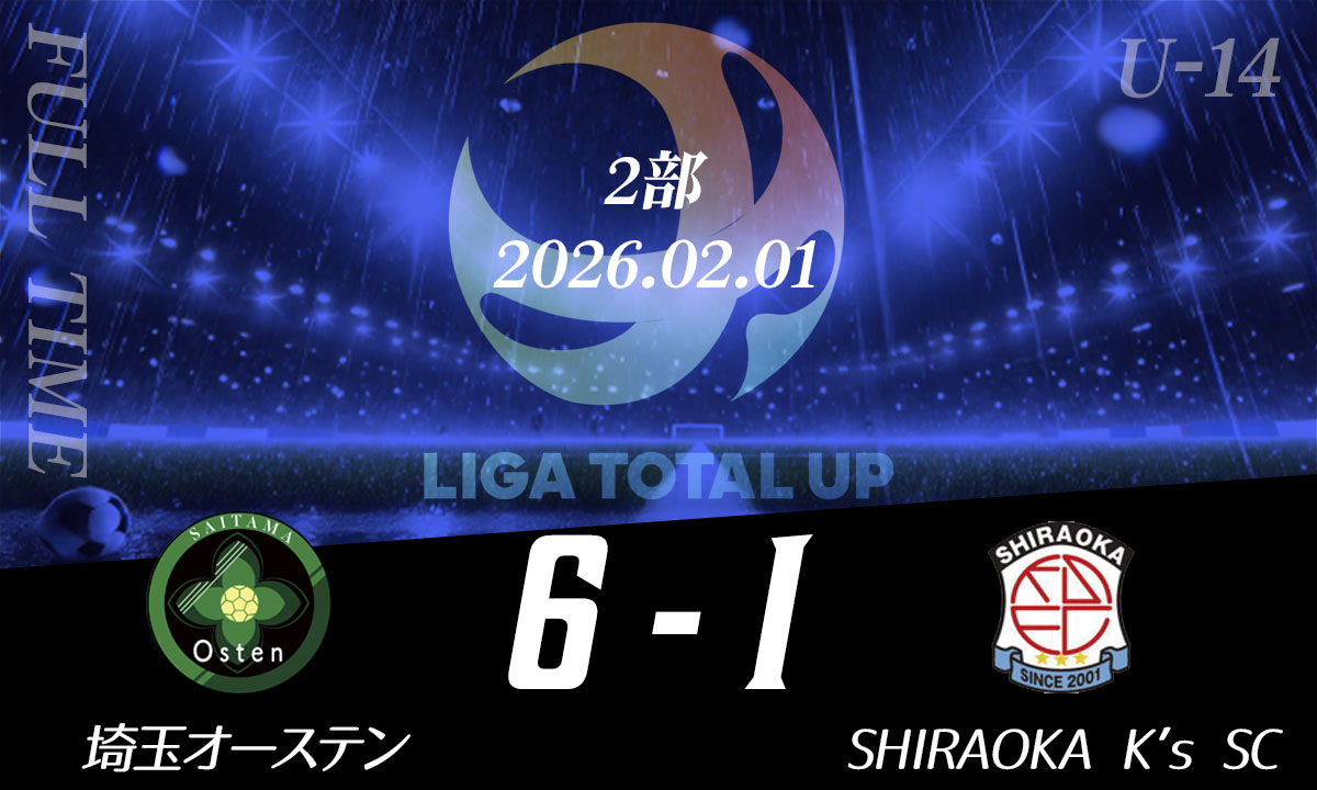 埼玉オーステン vs SHIRAOKA K’s SC 25 山崎颯馬×340 内田桔平9 生井陽大×2得点者16 井上恵太36 岡田颯汰MOM14 岩淵巡 その他試合結果 埼玉オーステン vs SHIRAOKA K’s SC2026.02.05フォルチFC vs ファルカオ久喜2026.02.05レストFC vs S.S.CANTERA2026.01.28フォルチFC vs 鴻巣ラホージャ2026.01.28FCプロスペリダージ vs アルティスタ浅間2026.01.28越谷FC vs アルティスタ浅間2026.01.22越谷FC vs S.S.CANTERA2026.01.22アルティスタ浅間 vs FC.L-BLOOM2026.01.22 フォルチFC vs ファルカオ久喜