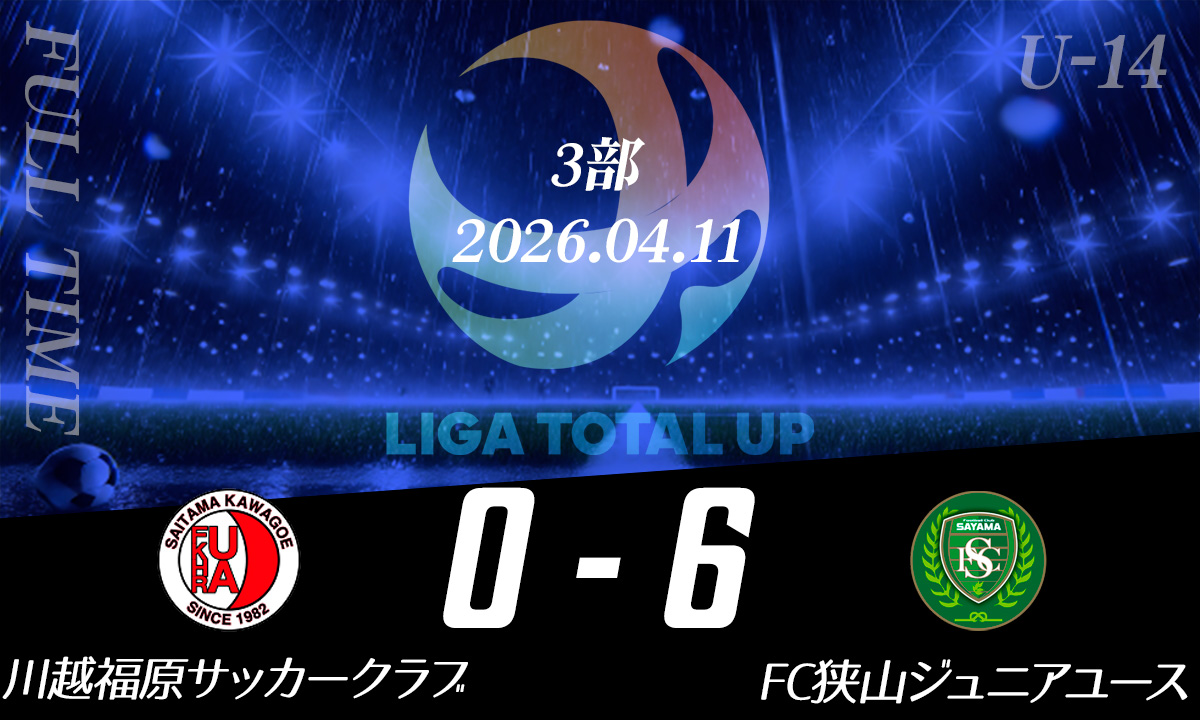 川越福原サッカークラブ vs FC狭山ジュニアユース ー得点者40 福丸睦基 × 269 工藤大朔 × 241 大村玲央62 内野涼空13 藤尾悦嗣MOM69 工藤大朔 その他試合結果 OKEGAWA FC vs 川口市立西中学校FC狭山ジュニアユース vs 川口市立西中学校川越福原サッカークラブ vs FC狭山ジュニアユース川越福原サッカークラブ vs 鴻巣FCOKEGAWA FC vs 鴻巣FC鴻巣FC vs 川口市立西中学校 上尾SC vs フォルチFCFC.L-BLOOM vs フォルチFC
