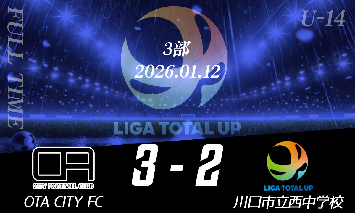 OTA CITY FC vs 川口市立西中学校 5 佐藤圭40 今井翔11 荒井柊祐得点者36 喜久雄斗OG19 神戸杏介MOM41 小野寺祐斗 その他試合結果 OTA CITY FC vs 川口市立西中学校FC.STIMOLANTE vs fervore富岡Y’s FOOTBALL CLUB vs AGEO CITY FCY’s FOOTBALL CLUB vs 川口市立西中学校AGEO CITY FC vs 川口市立西中学校FC八潮 vs 西武台新座中学校FC八潮 vs fervore富岡fervore富岡 vs 川口市立西中学校 2026/1/1~31試合結果川越福原サッカークラブ vs FC八潮
