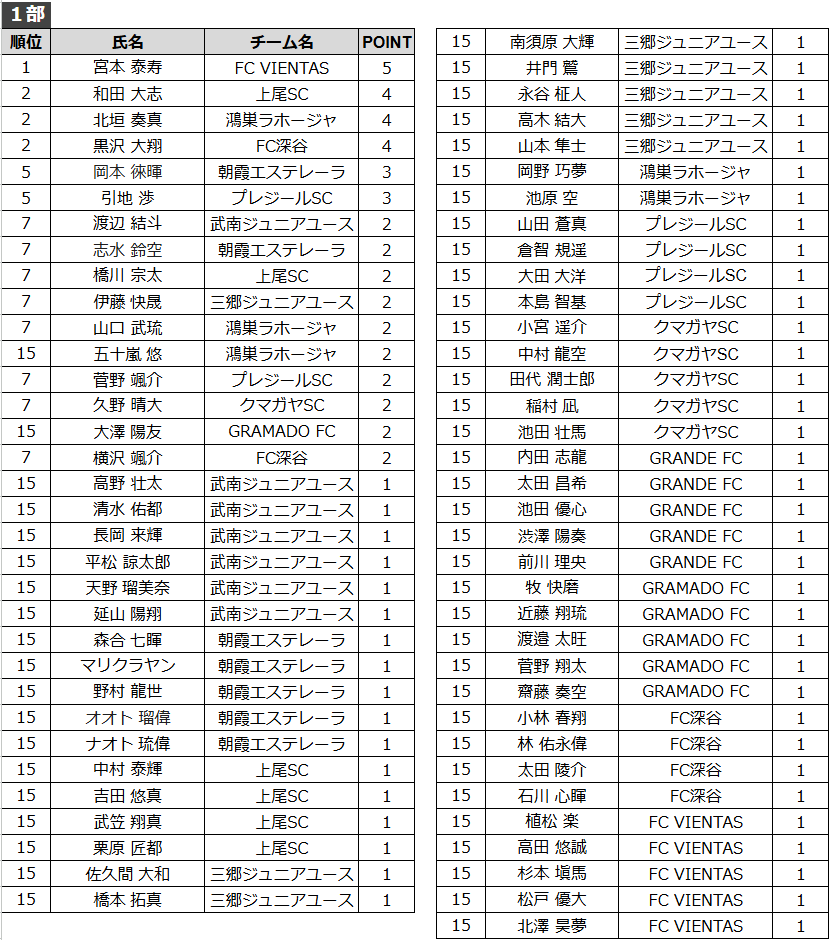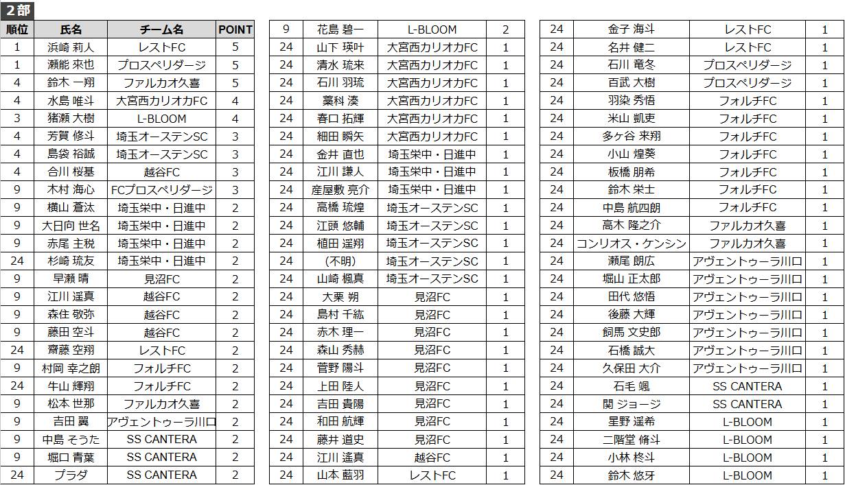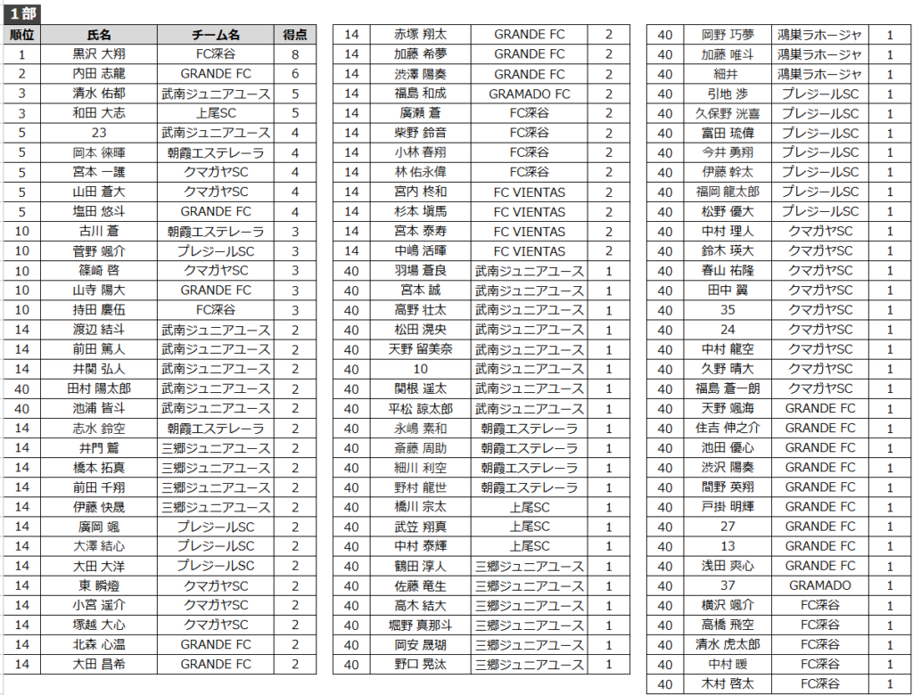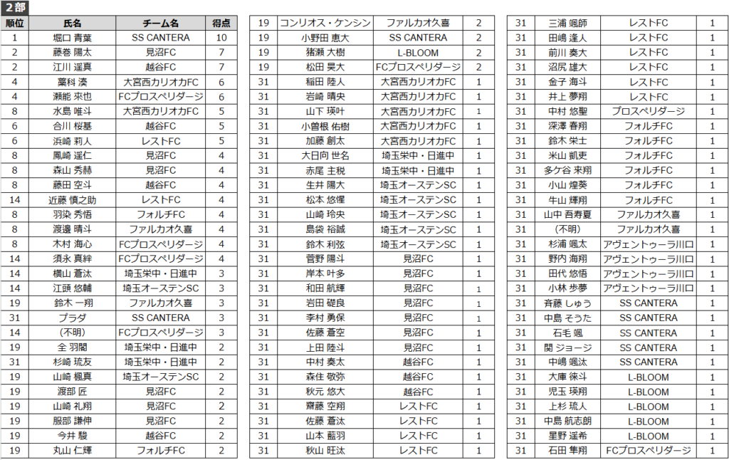 得点者ランキング(U13-2部)