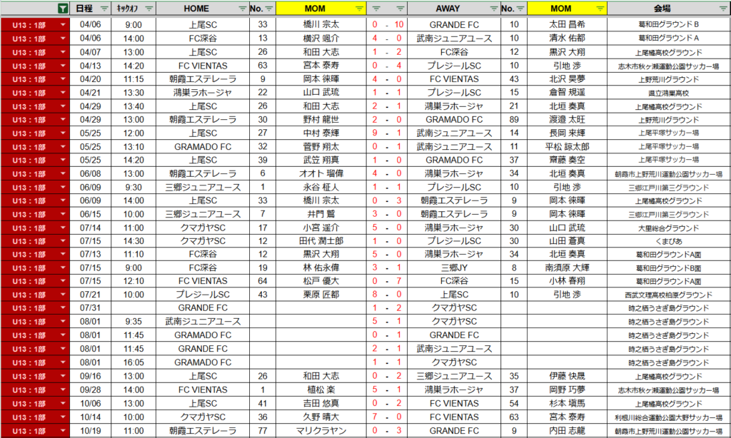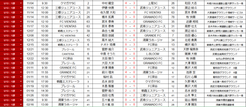 リーグ日程・結果(U13-1部)